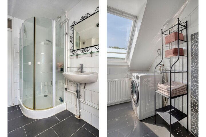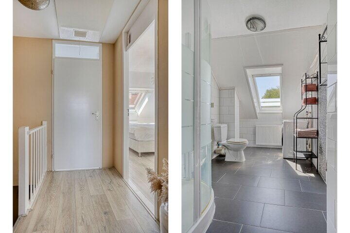 Overloop grenzend aan 2 zéér ruime slaapkamers en de badkamer. De badkamer is voorzien van een douchehoek, wastafel, toilet, wasmachine- en drogeraansluiting en een dakraam voor de natuurlijke ventilatie.